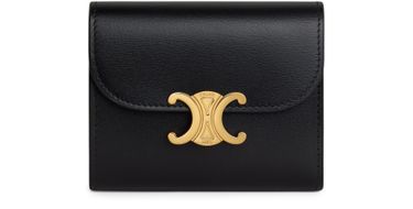 Celine's Triomphe small flap wallet in shiny calfskin is a luxurious accessory that embodies elegance. With its gold finishing and a triomphe metallic snap button closure, it offers both style and functionality. Featuring a folded coin pocket, five credit card slots, a note pocket, and a flat pocket, it’s perfect for the modern individual.