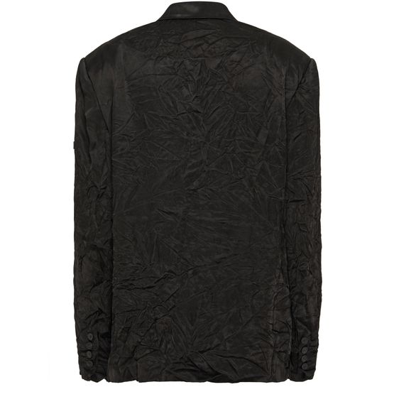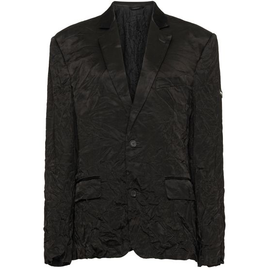 Description : Mirror satin, medium fit, notch lapel, 2 buttons single-breasted at front, 2 flap pockets, 1 piped pocket at chest, 4 button cuffs, balenciaga rubber tag on left sleeve, made in Italy, dry cleaning.