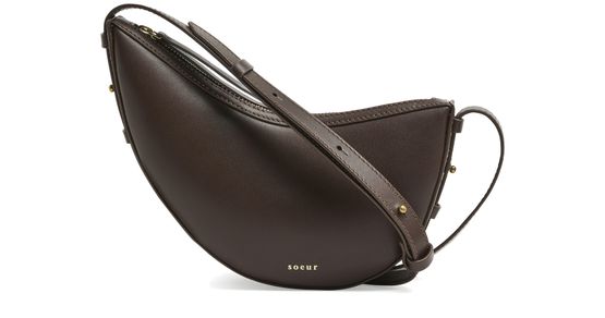 Unveil Soeur's Wino mini hobo bag, blending sleek design with practical elements. This bag features a zipper closure, gold finish, and a leather handle. Its adjustable strap allows it to be worn on the shoulder, while the front logo in gold letters and visible topstitching add a refined touch.