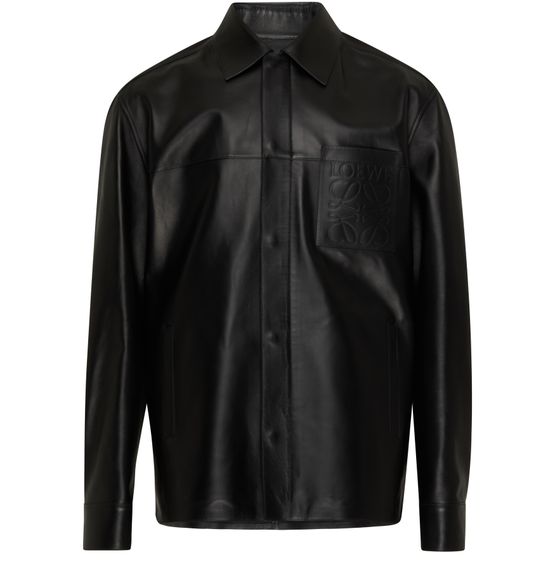 Loewe's Zip-up overshirt in nappa lambskin is a long-sleeved shirt with a chest logo and embossed logo at the back label. It has side welt pockets, a breast pocket, and patch pockets. The shirt features a concealed closure for a sleek look.