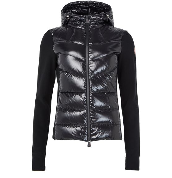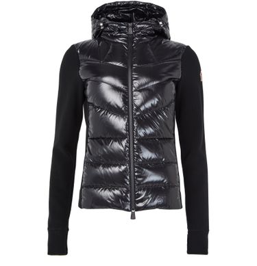 Introducing Moncler Grenoble's zippered cardigan, a masterpiece of bi-material design. This long-sleeved piece features an iridescent finish, a detachable hood with snap buttons, and a zipper closure. The embroidered logo on the side adds a touch of elegance, making it perfect for both casual and formal occasions.