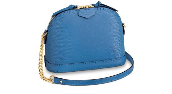This adorable version of the ladylike Alma in grained Blue Epi leather is a versatile day-to-evening piece. Trendy yet timeless, it features a long strap – perfect for cross-body wear – adorned with a golden-chain detail. Signatures include an embossed LV logo and a “Louis Vuitton Paris” patch.