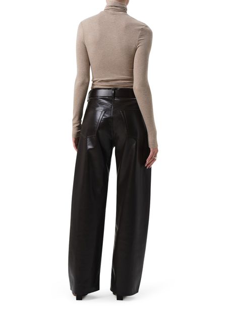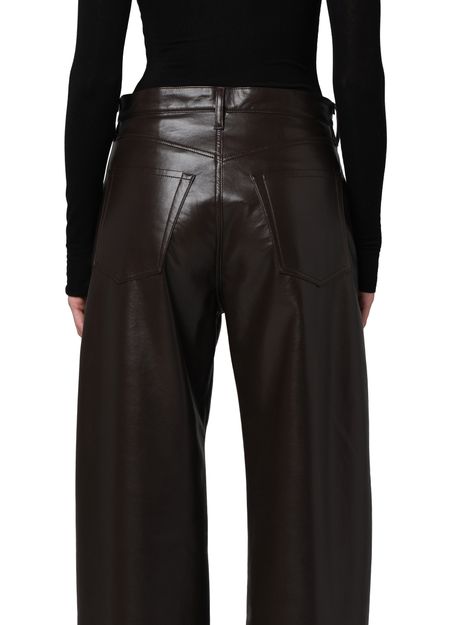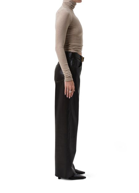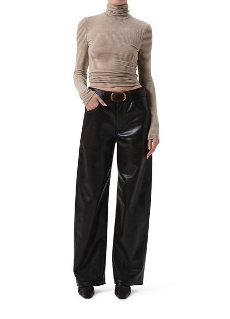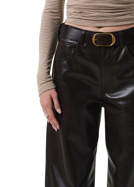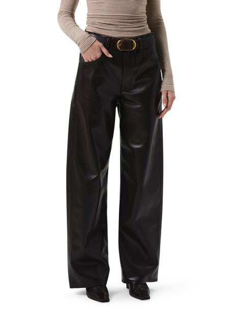 Reveal Coh Holiday's high-waisted ankle-length pants, featuring a sleek black leather finish. Designed with a buttoned zipper closure and belt loops, this pants offers both style and functionality. Front and back pockets add practicality, making it a versatile choice for any wardrobe.