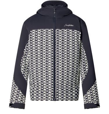This sporty blouson features panels of the LV Doves houndstooth motif in a graphic monochrome print set against black technical fabric. This lightly padded, waterproof piece has adjustable velcro cuffs with contrasting tabs and a zip closure featuring an LV puller. An embroidered signature on the chest adds a contrasting finish.