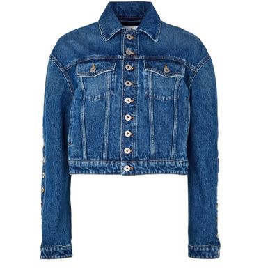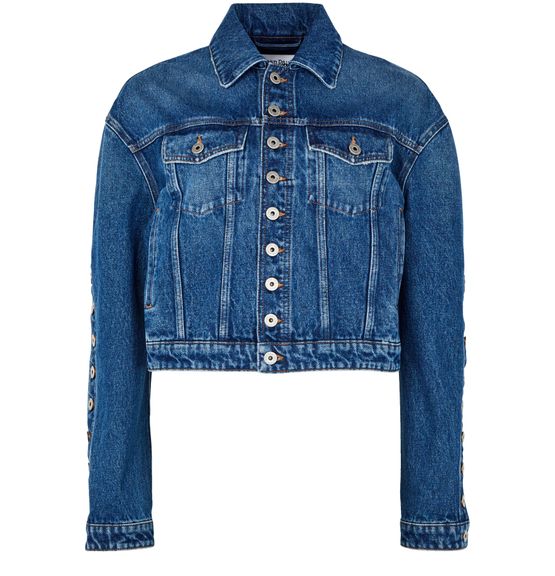Description : long-sleeved, front buttoned closure, short, denim, engraved logo, appliquéd logo, logo on the side, logo at the back, two front pockets, flap pockets.