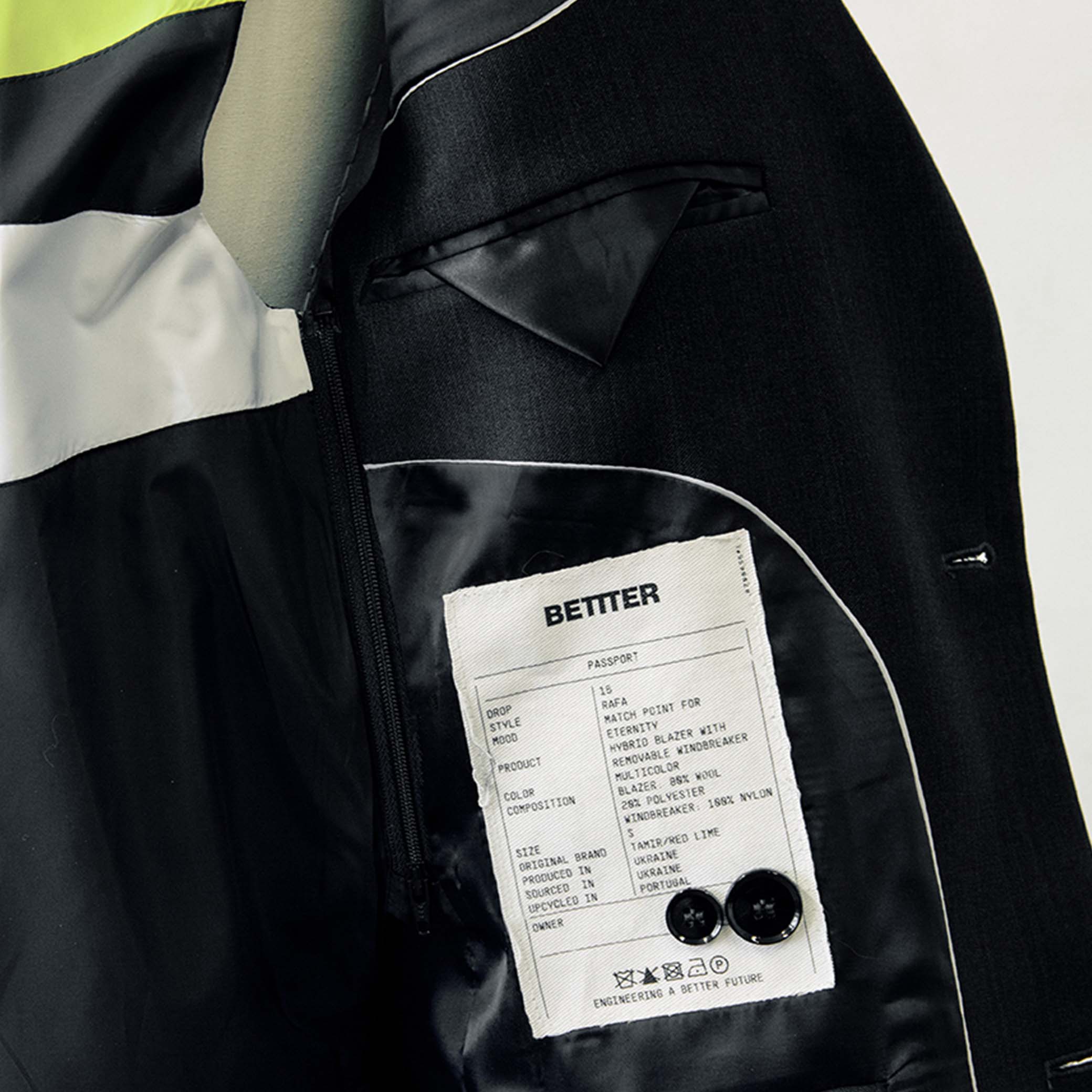 The Bettter silhouette is a tribute to feminine power. Modern, sporty and easy to wear, its suit made from deadstock fabric is combined with a zipped windbreaker for a look in shades of grey and neon yellow.