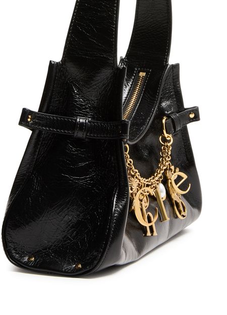Reveal Chloe's Chloé Charms handbag, a blend of elegance and modern flair. Crafted from glossed leather, it features a striking metal horse medallion and gold-tone charms. The single handle and zipper closure ensure effortless style, while the visible topstitching and front logo complete its sophisticated design.