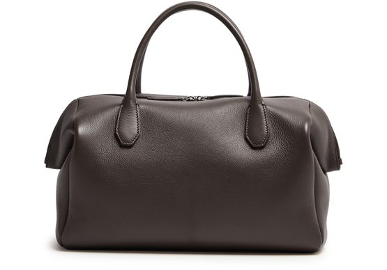 Reveal The Row's Faye leather handbag, crafted from grained leather with double handles and a thin strap for versatile carrying. The visible stitching and silver finish highlight refined details, while the spacious interior and zippered pocket ensure both style and practicality. A front logo completes this modern essential.