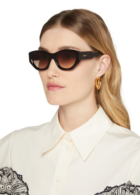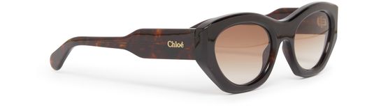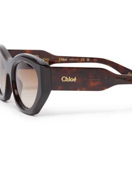Chloé Gayia sunglasses feature a cat-eye shape with tinted lenses and thick temples. The logo on the temples adds a touch of elegance to the design.