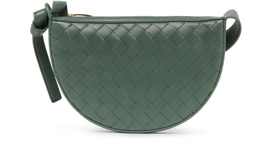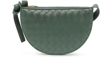 Bottega Veneta's Half-moon bag is a stylish mini bag with a handle for versatile carrying options. It features a zipper closure and a sleek silver finish. This bag can be worn in the hand or on the shoulder, making it a perfect accessory for any outfit or occasion.