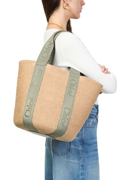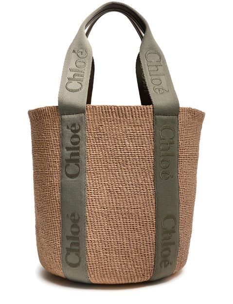 • Description : Basket, shoulder bag, signature saddle stitch, topstitched "chloé" logo, double handles, canvas handles, jacquard logo, front logo, open weave.