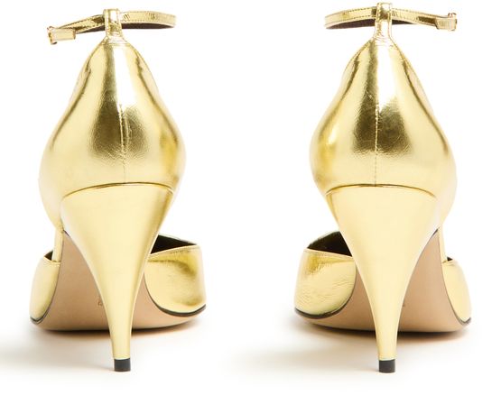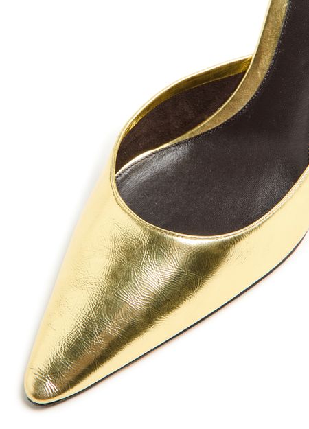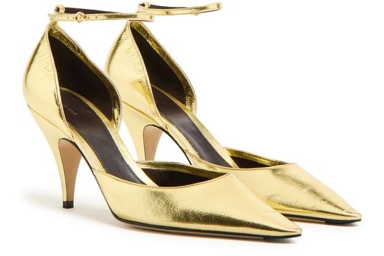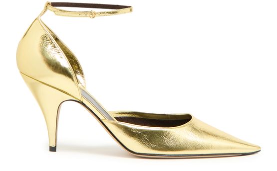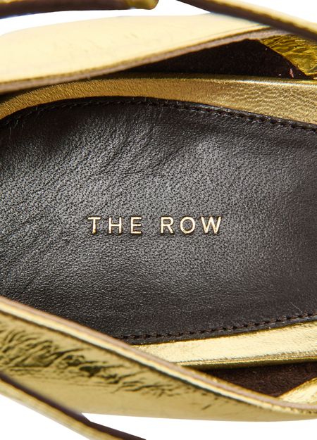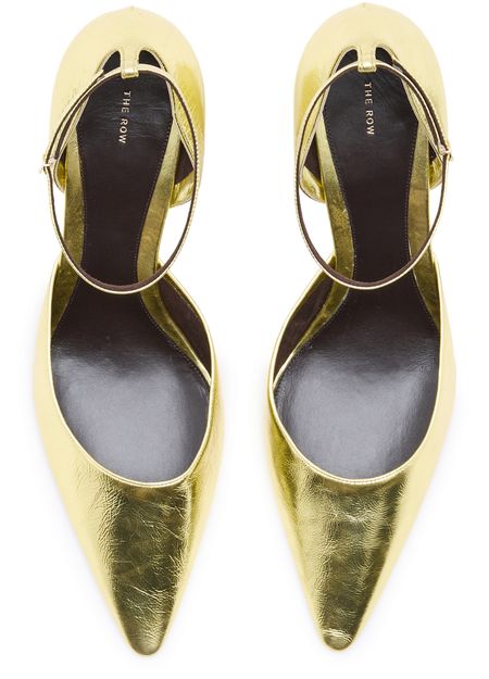The Row's Liisa D'Orsay pumps elevate your style with a chic pointed toe and medium heel. A buckled ankle strap adds sophistication, while visible stitching highlights craftsmanship. The gold finish gleams subtly, complemented by a logo-printed insole. Perfect for any occasion, these closed pumps are a timeless addition to your wardrobe.