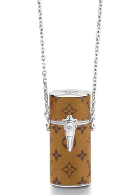 Iconic Monogram canvas and an Art Deco shape combine to create this elegant lipstick case. Inspired by 1920s makeup boxes, this piece features a lock inspired by historic Louis Vuitton trunks and is delicately engraved with an LV Circle logo. This compact accessory can be worn as a jewelry or to adorn the outside of a favorite bag.