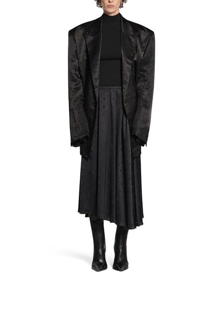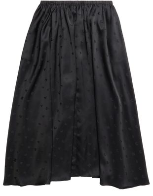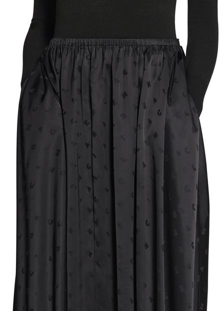 Balenciaga's Jupe Élastique features logo letters all over in viscose jacquard. It has a large fit, mid-waist, and elasticated waistband. The skirt has an asymmetric bottom line and falls below the knee length.