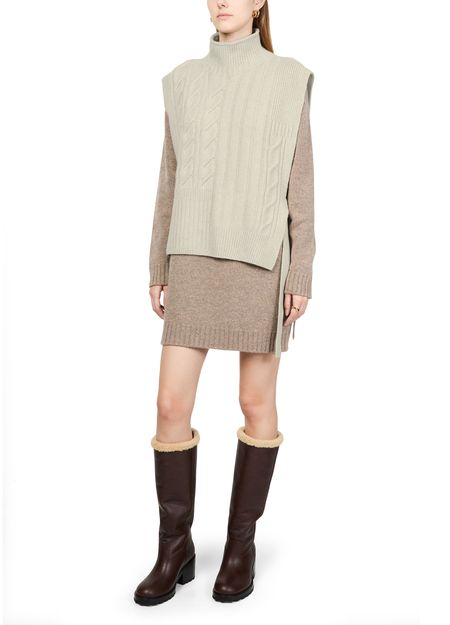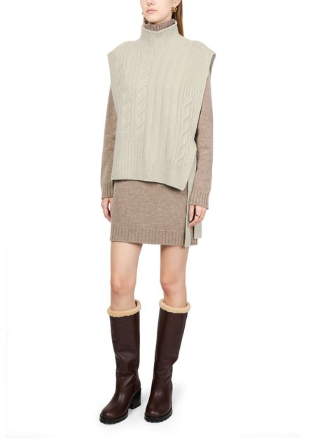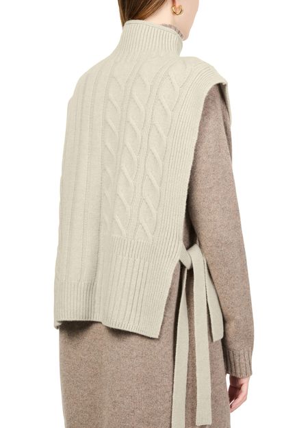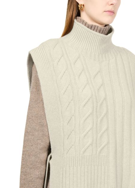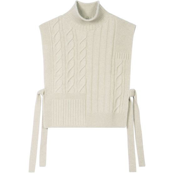 • Description : Boxy fit, ribbed, rollneck / turtleneck, bow fastening, sleeveless.