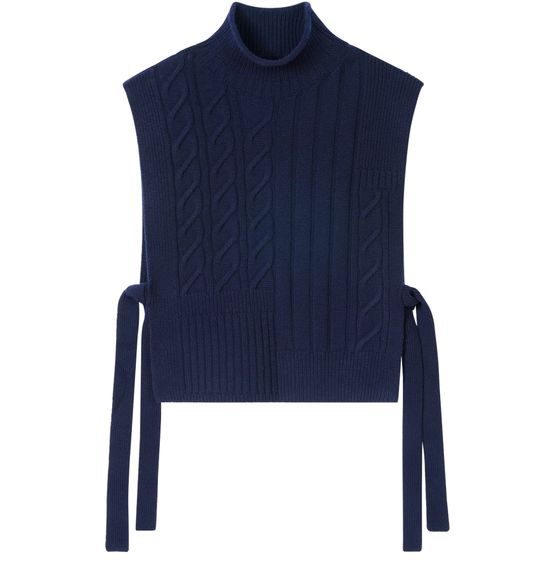 Introducing Bompard's long belted cable knit bib sweater, a masterpiece of modern design. This boxy fit sweatshirt features a chic rollneck and sleeveless style, enhanced by a bow fastening. The ribbed texture adds a touch of elegance, making it perfect for versatile styling across seasons.