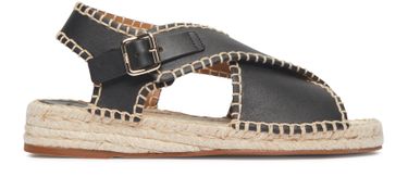 • Description : Open round toe, smooth leather, visible topstitching, buckled ankle strap, gold metal finishes, logo-printed insole, braided rope/jute sole, thick outsole.