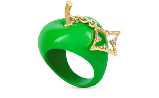 This LV Fruits Ring is shaped like an apple with a bright enamel finish and a polished hardware stem. It is detailed with a hanging Monogram Flower charm featuring sparkling crystal rhinestones set by hand. This jewellery piece echoes the season's new Fruits theme and is a perfect complement to many items from the Leather Goods Collection.