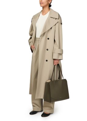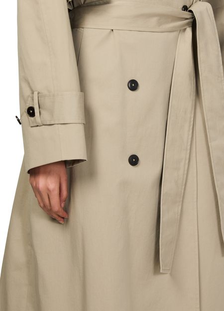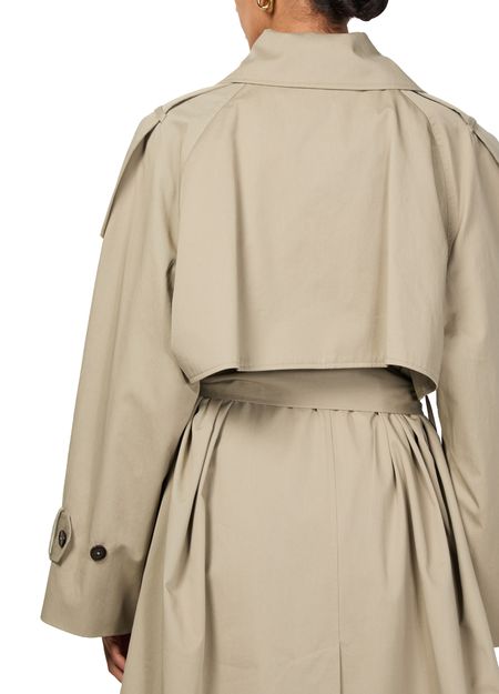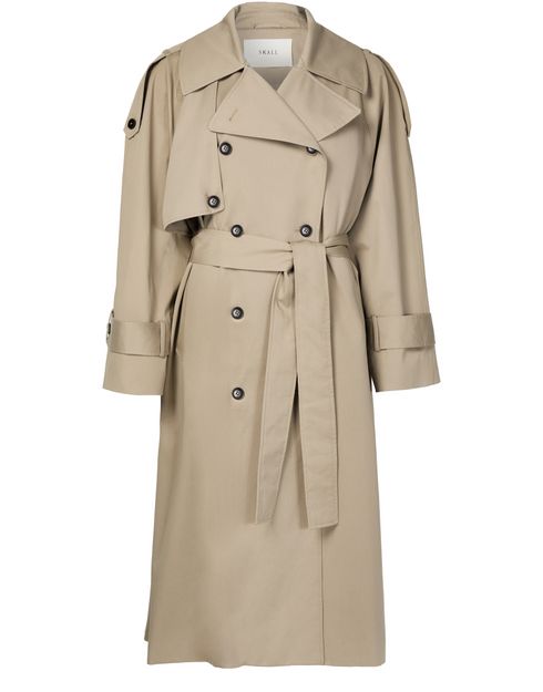 Skall Studio's Mahsa trenchcoat redefines oversized elegance with its long, flowing silhouette. Featuring embellished buttons and a collar neckline, this piece adds flair to any outfit. Practical flap pockets and a double-breasted button fastening enhance its functional style, perfect for versatile wear throughout various occasions.
