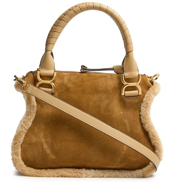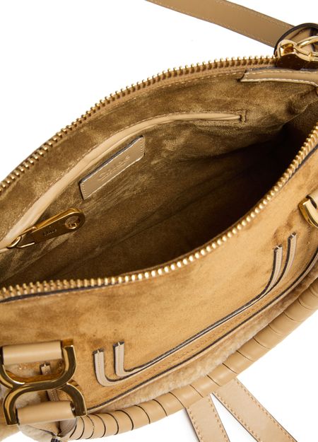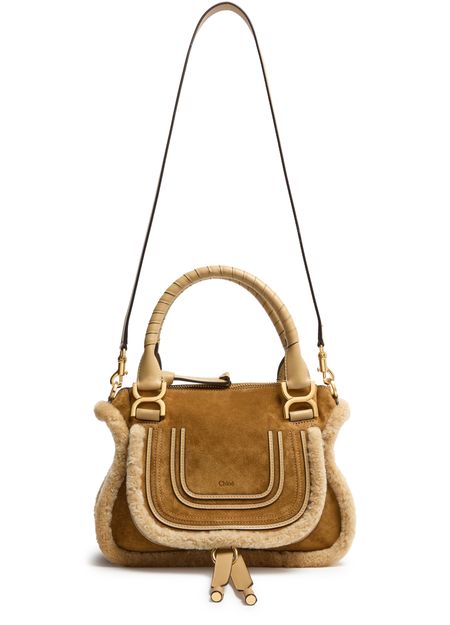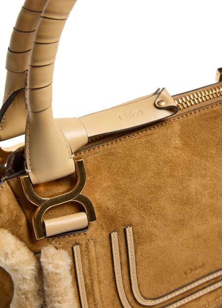 Introducing Chloé's Marcie handbag, a masterpiece of elegance and functionality. Crafted from luxurious suede, it features signature saddle stitching and a front logo. The adjustable, detachable strap and zippered interior pocket enhance its versatility, making it a perfect companion for any occasion.