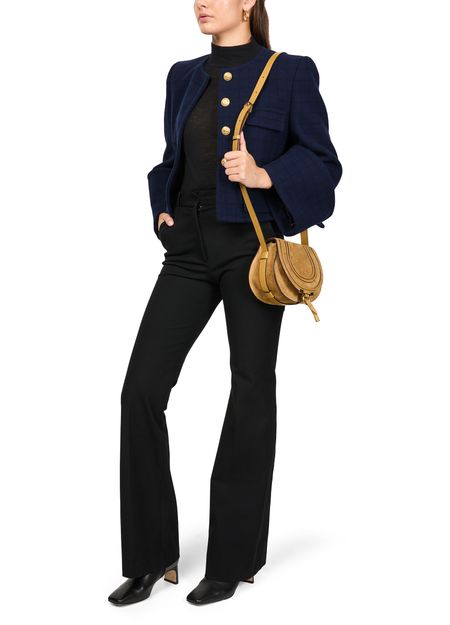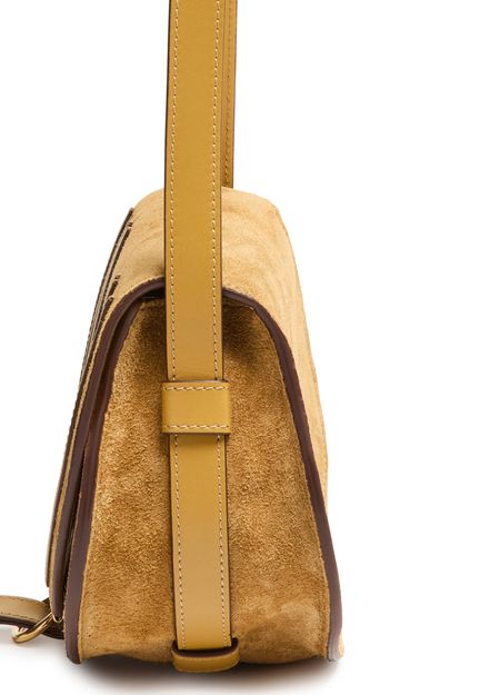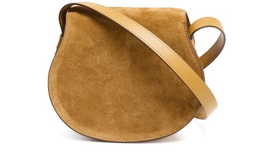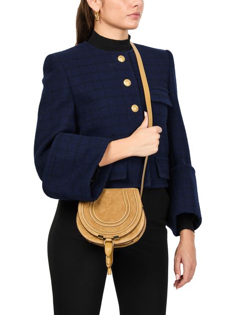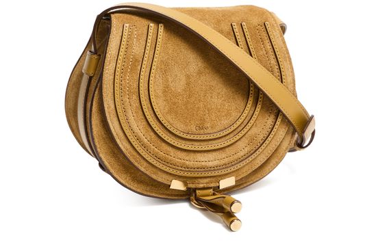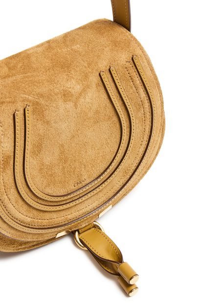 Celebrate Chloe's Marcie shoulder bag with its signature saddle stitch detailing. Crafted in sumptuous suede, it features a flap closure and adjustable thin strap for versatile wear. The interior pocket and gold finish add a touch of elegance, making it both stylish and functional.