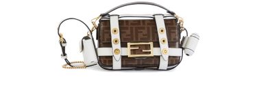 The original and unique shape of Fendi's Mini Baguette hand bag is truly surprising. With a large gold tone rectangular clasp and six matching eyelets, this piece is decidedly elegant. There is an adjustable strap, and two side pockets for little objects, as well as the main compartment.