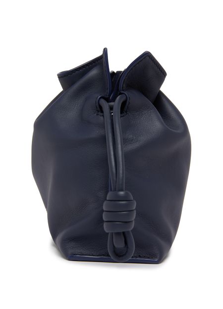 Loewe's Mini Flamenco clutch features a front logo in silver letters and a drawstring closure. It can be hand carried with its thin strap or worn on the shoulder or crossbody with the detachable strap. This versatile bag is perfect for adding a touch of elegance to any outfit.