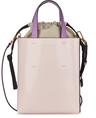 Marni's Museo mini Bag in leather offers versatility with its handles and detachable strap, allowing it to be hand carried, worn on the shoulder, or styled crossbody. The single compartment features an interior pocket for essentials, while the front and embroidered logos add a touch of elegance to this chic accessory.