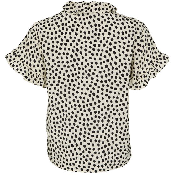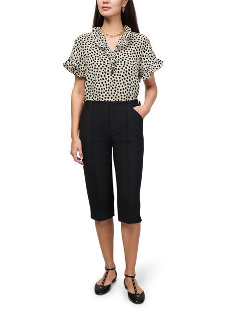 Reveal Chloe's printed blouse, featuring a high-neck and ruffled short sleeves for a refined silhouette. The polka dot pattern and signature saddle stitch add a playful yet sophisticated touch, making this top a standout choice for both casual and elevated ensembles.