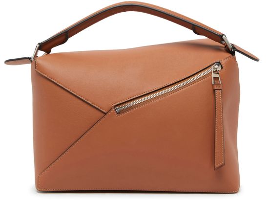 Loewe's Puzzle bag in classic calf leather showcases a unique design with a zipper closure and flap closure. Its single compartment offers ample space, complemented by a back pocket for essentials. With a single handle and a wide strap, it’s perfect for hand carrying. The silver finish and appliquéd logo add elegance, while visible topstitching enhances its sophisticated look.