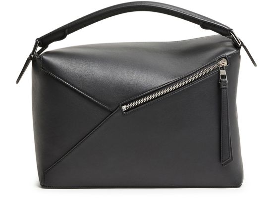Loewe's Puzzle bag in classic calf leather showcases a unique design with a zipper closure and flap closure. Its single compartment offers ample space, complemented by a back pocket for essentials. With a single handle and a wide strap, it’s perfect for hand carrying. The silver finish and appliquéd logo add elegance, while visible topstitching enhances its sophisticated look.