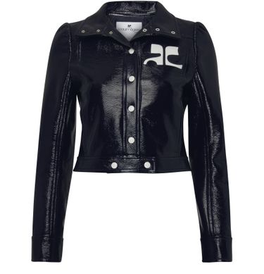 This reedition vinyl jacket features a long-sleeved design with a front buttoned closure for a sleek look. It showcases a front logo and chest logo, as well as a logo at the back label for added brand recognition. The jacket is accented with studded details, a crop length, and a stylish silver finish.
