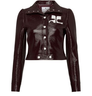 This reedition vinyl jacket features a long-sleeved design with a front buttoned closure for a sleek look. It showcases a front logo and chest logo, as well as a logo at the back label for added brand recognition. The jacket is accented with studded details, a crop length, and a stylish silver finish.