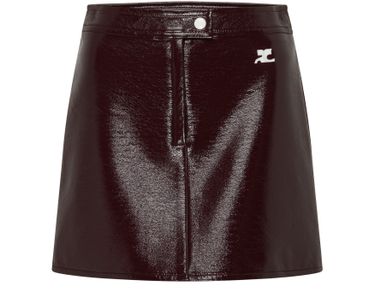 Reveal Courreges's Reedition Vinyl mini skirt. The mini length and straight silhouette are enhanced by visible stitching and a front logo, while button and concealed zipper closures ensure a sleek, comfortable fit for versatile day-to-night styling.