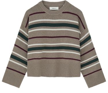 Reveal Skall Studio's crop round neck sweater, crafted in ribbed fabric with a striped print. The dropped sleeves and long-sleeved silhouette offer a relaxed yet refined look, making it a versatile choice for layering or pairing with high-waisted pieces for a modern statement.
