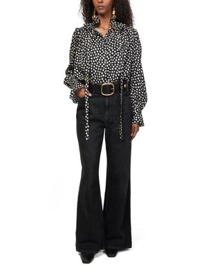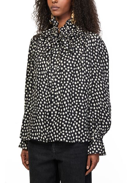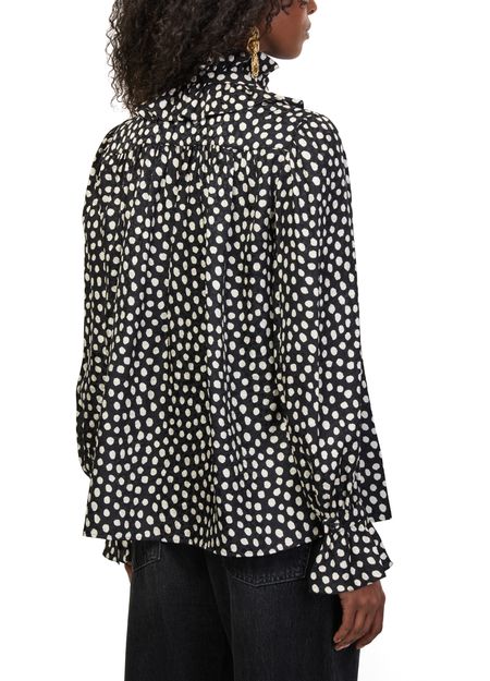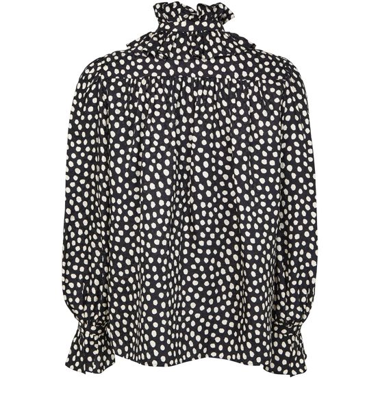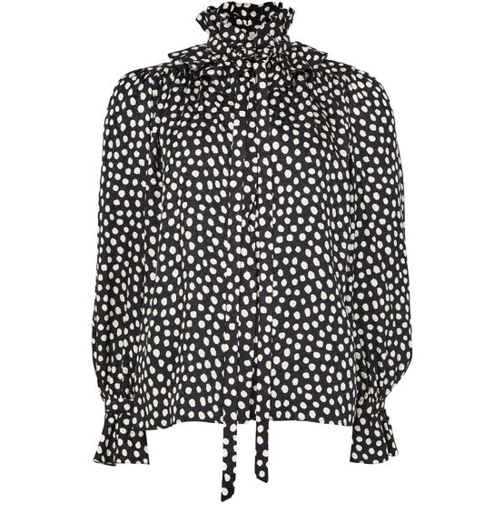 Reveal Chloe's polka dot blouse, featuring a high-neck and ruffled long sleeves for a refined silhouette. The playful polka dot pattern adds a lively touch, while the elegant design ensures effortless pairing with tailored pants or skirts for both day and evening occasions.