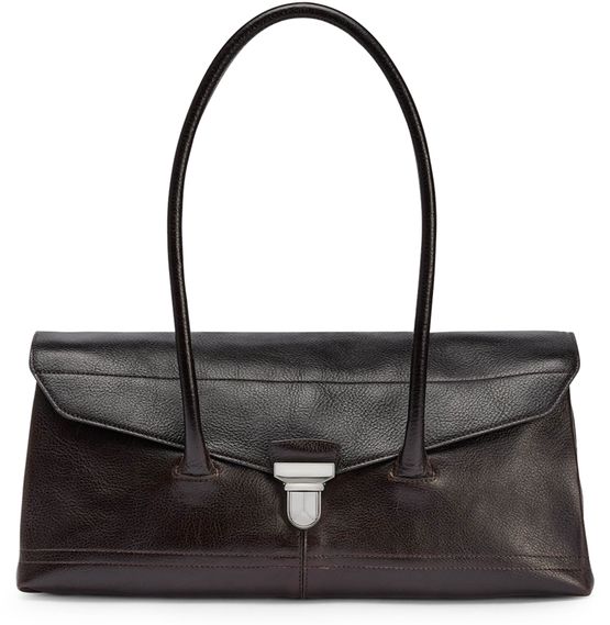 • Description : hand carried, worn on the shoulder, back pocket, flap closure, visible topstitching, logo at the back, engraved logo, messenger bag, silver finish, thin strap.