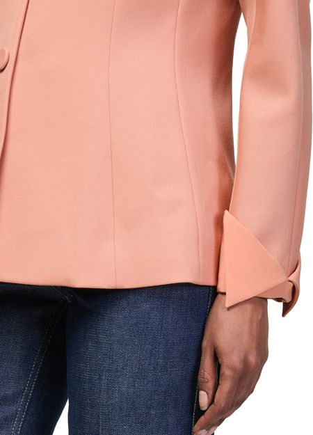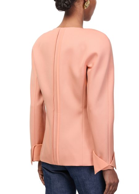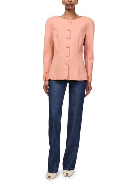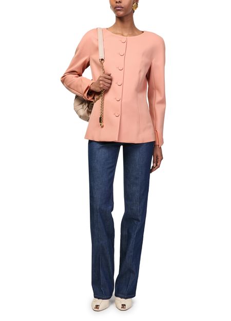 Reveal Chloe's single-breasted jacket, a short, collarless silhouette with long sleeves and a front buttoned closure. The button, covered in the same fabric, adds a refined touch. This versatile piece transitions seamlessly from day to night, making it a standout for any modern wardrobe.