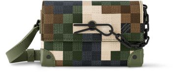 Creative Director Pharrell Williams brings his new Damoflage coated canvas to the Steamer Wearable Wallet. The Damoflage motif is a brilliant mashup of Damier checkerboard with camouflage for a pattern that’s modern and historic at once. The black-color pin-and-chain, from the House’s original steamer trunks, completes the design.