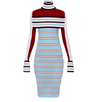 The body-hugging shape of this stretchy knit dress is one of the collection’s key silhouettes. The piece contrasts casual modernity with details from the 18th century ceremonial theme, such as a wide silk band on the chest, high neck and prominent silk cuffs.