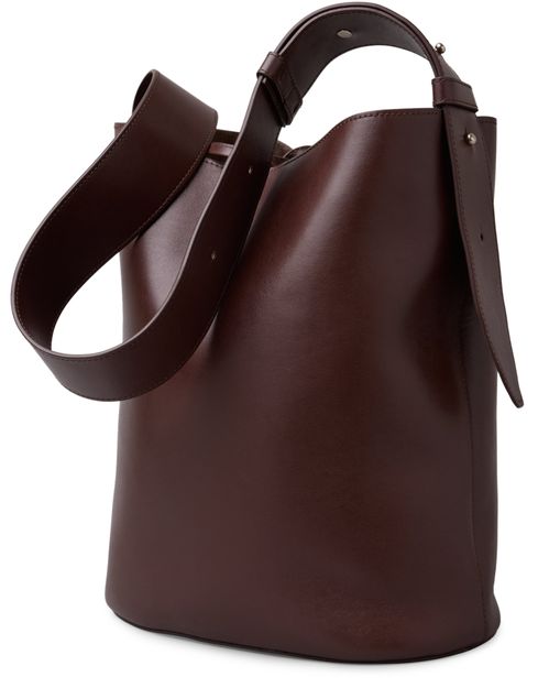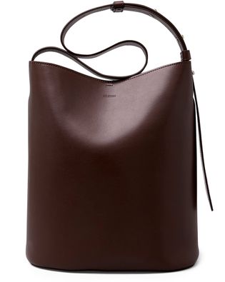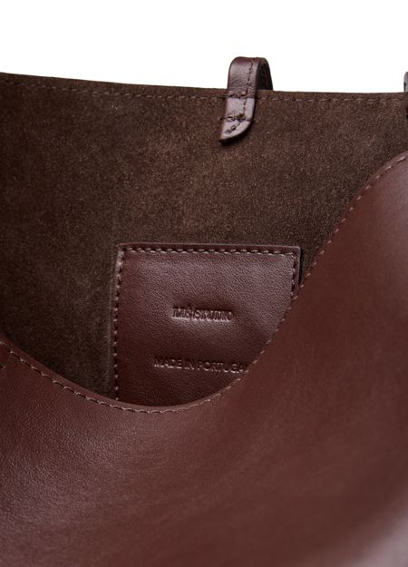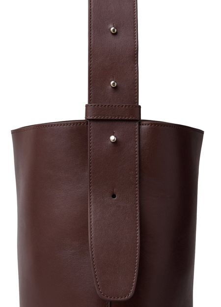 Reveal Lie Studio's the Norma tote bag, crafted from smooth leather with a wide, adjustable strap for versatile wear. The front features an embossed logo and visible stitching, while the drawstring closure adds a modern touch. This tote blends refined design with everyday practicality.