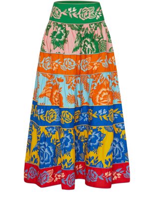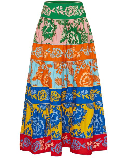 Farm Rio's Tiered maxi skirt showcases a stunning floral print that dances with every step. Its midi length offers a playful silhouette, while the visible stitching adds a touch of artisanal charm. Perfect for sunlit strolls or vibrant gatherings, this skirt effortlessly combines elegance and comfort in one beautiful piece.