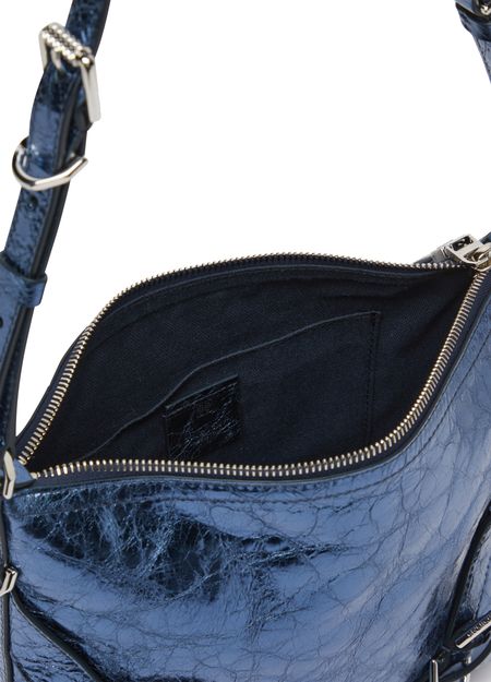 Givenchy's Voyou laminated leather crossbody bag showcases visible topstitching and a front logo in silver letters. With a zipper closure and a single compartment, it offers practicality. The thin strap, adjustable for comfort, allows it to be worn on the shoulder, while the interior pocket adds convenience to your style.