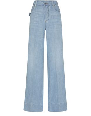 Bottega Veneta's wide-leg jeans are designed with an ankle length and feature a buttoned and concealed zipper closure for a sleek look. They are detailed with the brand's logo at the back and an appliquéd logo on the front pocket. With a classic five-pocket style and patch detail, these jeans are a timeless wardrobe staple.