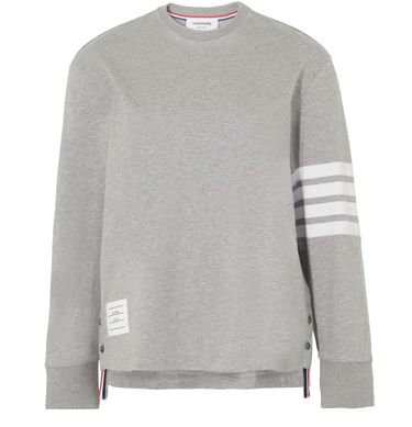 Thom Browne's 4-Bar long sleeve t-shirt showcases a straight cut and ribbed texture, perfect for layering. Its round neck and cuffs add a refined touch, while the iconic striped pattern highlights the brand's signature motif. A subtle label with logo completes this essential piece, embodying modern sophistication effortlessly.