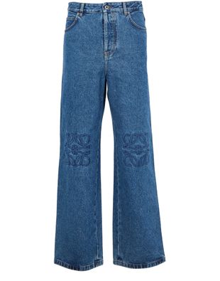Introducing Loewe's Anagram baggy jeans. With a wide-cut, high-waisted fit, these jeans promise unmatched comfort and style. Crafted from faded denim, the jeans exhibit exquisite patch details and visible stitching. Equipped with a buttoned zipper closure and practical belt loops, they are perfect for versatile styling.