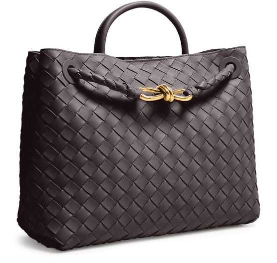 • Description : Shoulder bag, shopper / tote bag, intrecciato weaving technique, iconic bow clasp, single handle, leather handle, visible topstitching, gold finish.