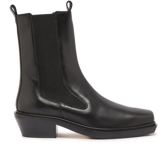 Aeyde's Antonia calf leather ankle boots showcase a high-top upper with elasticated sides for a snug fit. The smooth leather is accented by visible stitching, while a leather loop at the back allows for easy slipping on and off. With a medium beveled heel and round toe, these closed boots blend style and comfort effortlessly.
