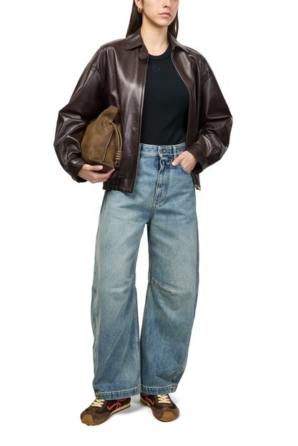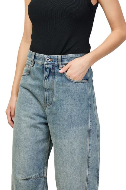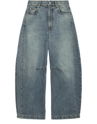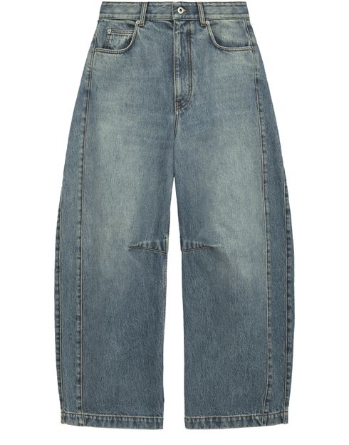 Reveal Loewe's barrel-leg jeans, crafted from premium denim with a modern ankle-length silhouette. The buttoned zipper closure, visible stitching, and belt loops add refined detail, while two front pockets offer practicality. These jeans blend comfort and sophistication, making them a versatile staple for any contemporary wardrobe.