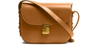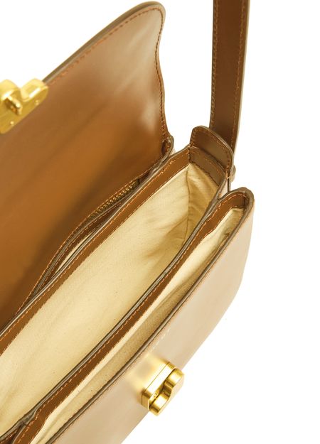 Reveal Soeur's Bellissima mini shoulder bag, featuring a sophisticated flap closure and a gold finish. This stylish piece boasts a single handle and wide strap, complemented by visible topstitching that adds a modern touch.